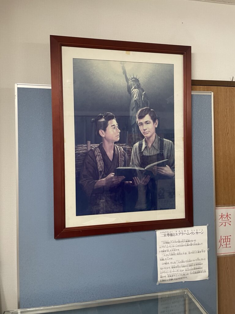 それは、二宮金次郎ファンの私として、二宮尊徳とアメリカの第16代大統領になったエブラハム・リンカーンが自由の女神の前で本を読んでいる絵を写した写真を直接見たかったからです。